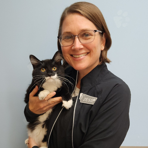 Jess is a licensed veterinary technician who hails from North Muskegon, MI. She received her Bachelor’s degree in Veterinary Technology from MSU in 1999. Jess started her career in veterinary medicine at a small animal hospital before joining the Shaver Road Animal Hospital team in July of 2008, where she became the hospital’s first licensed veterinary technician. Jess’ love for veterinary technology stems from the variety of tasks her job entails. From laboratory work and performing dental prophylaxis to anesthesiology, there is never a dull moment in her workday. Her favorite aspect of her job, however, is forming bonds with patients and their owners.