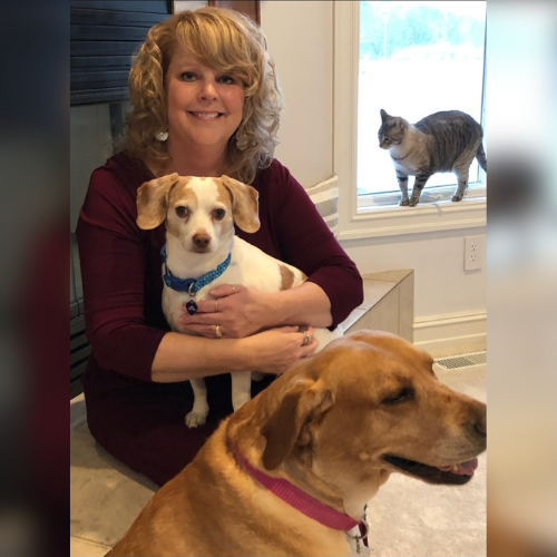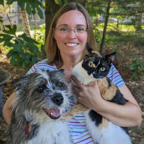 At home, she has four rescued fur babies: a Border Collie/German Shepherd mix (Kyra), a Shepherd mix (Odin), a German Shepherd (Vera), and a cat who rules them all (Oliver).